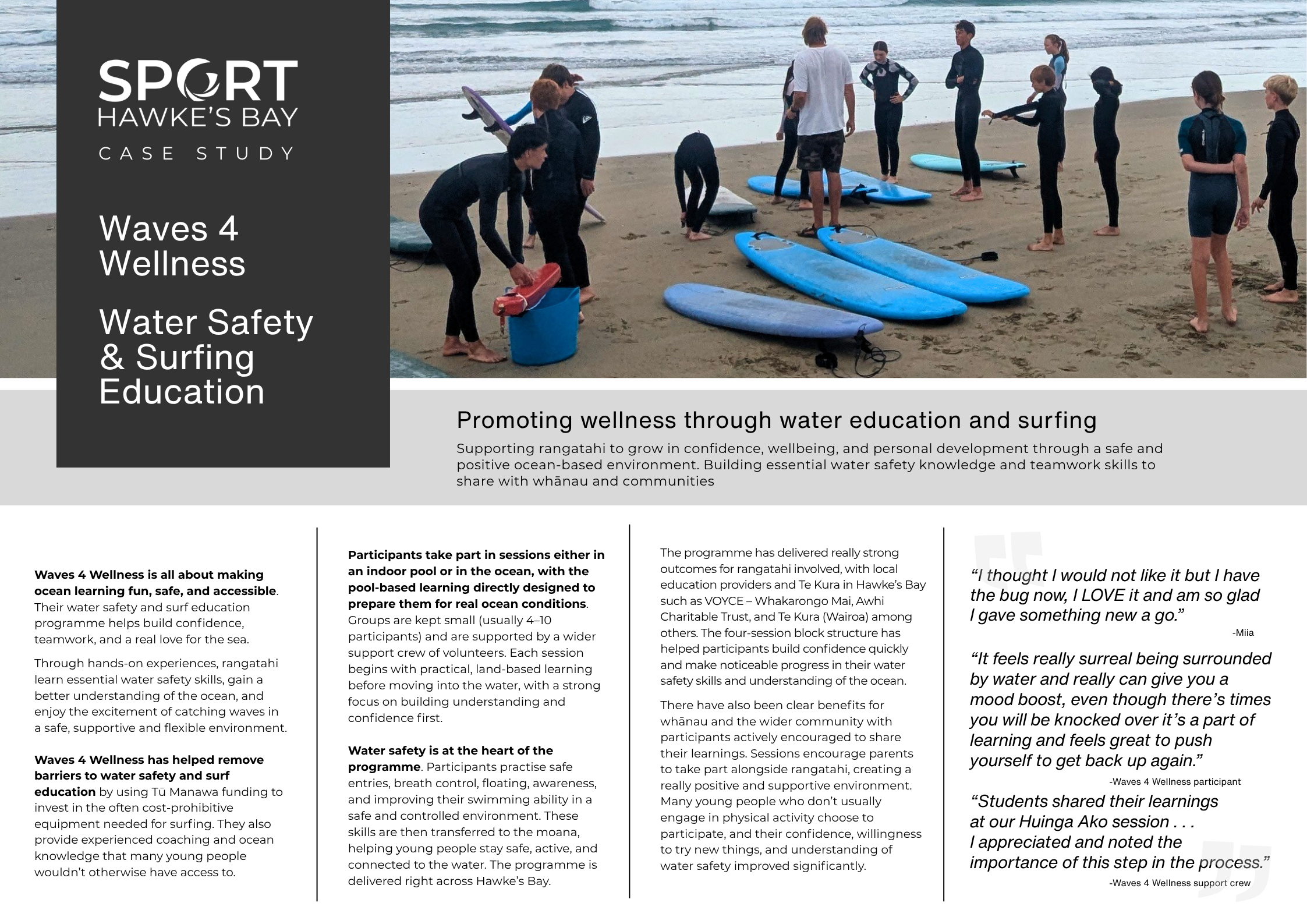As a coastal region, Sport Hawke’s Bay understands the importance in increasing peoples confidence and knowledge within the open water and have been running block courses since 2012. The courses, ranging from 4 - 6 weeks depending on weather conditions, focus on how to manage the conditions, entering and exiting the water safely, treading water, extending